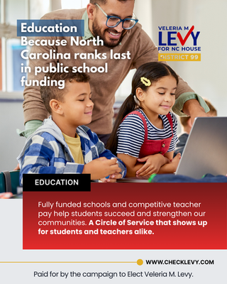 The Brand: Check Levy is the campaign under which Veleria M. Levy ran for North Carolina House District 99, framing her vision around "A Circle of Service."